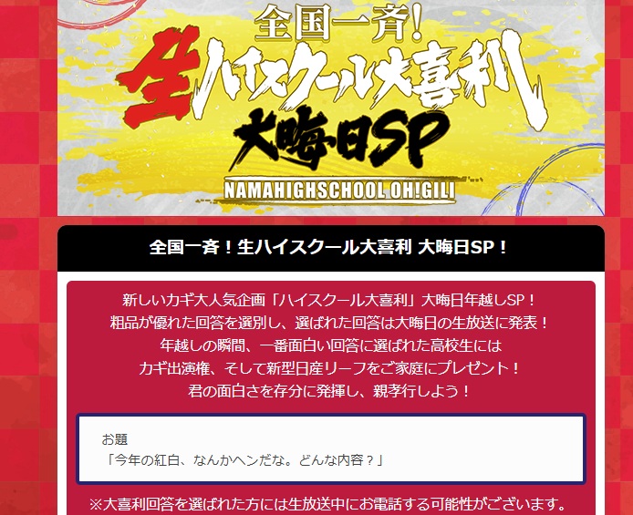 新しいカギ「全国一斉!生ハイスクール大喜利 大晦日SP」応募方法まとめ。お題に答えて応募→選ばれた回答は大晦日の生放送で発表。最優秀はカギ出演権+新型日産リーフ(1名)。応募フォームの注意点や条件も解説。 -
