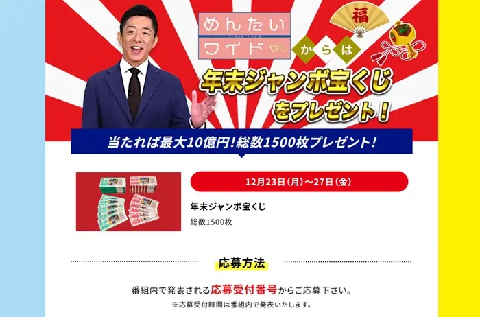FBS福岡放送で毎週月曜から金曜15時48分から帯放送の情報番組「めんたいワイド」ではプレゼントWEEK視聴者プレゼントを行っています。 賞品は最高10億円の当たる年末ジ...