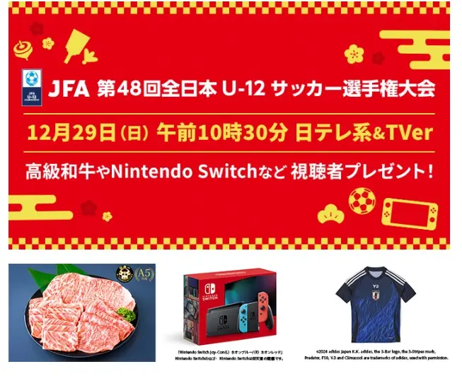 日テレ系列で12月29日10時30分から放送の「JFA 第48回全日本U-12サッカー選手権大会 決勝」では視聴者プレゼントをやっています。 賞品は鹿児島牛の食べ比べセットやNi... -