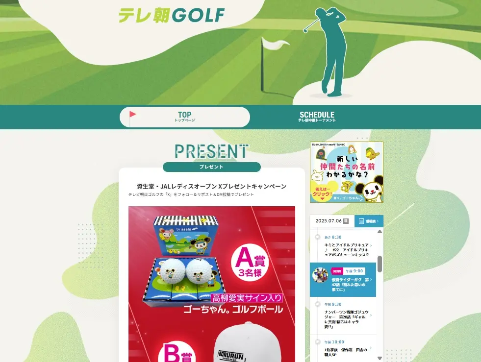 テレ朝チャンネルで7月3日から6日放送のゴルフ「資生堂・JALレディスオープン」では視聴者プレゼントをやっています。 賞品は「高柳愛実サイン入り ゴーちゃん。ゴルフ... -