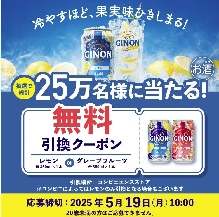 アサヒGINON コンビニ無料引き換えクーポン25万名プレゼントキャンペーン