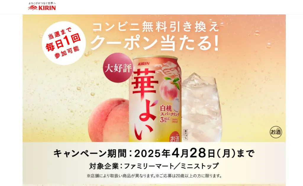 キリンから、4月22日から28日までの7日間、「華よい コンビニ無料引き換えクーポンが当たる!キャンペーン」をやっています。 賞品は「キリン 華よい 白桃スパークリン... テレ懸