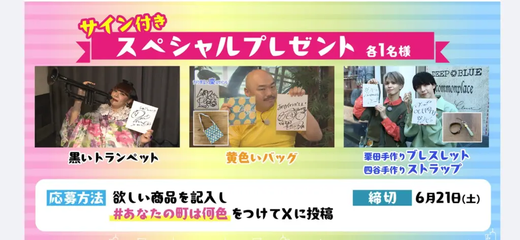 あいテレビで6月7日14時00分から放送の特番「Colorful World~あなたの町は何色!?~」では視聴者プレゼントをやっています。 賞品はモノマネ芸人みかんさんや、クロちゃ... -