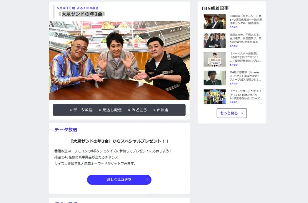 TBSで5月4日19時から放送した「大泉サンドの年2会」では視聴者プレゼントをやっています。 賞品はお米10キロや幻の焼き芋3キロなどで合計40名に当たります。 応募方法は...