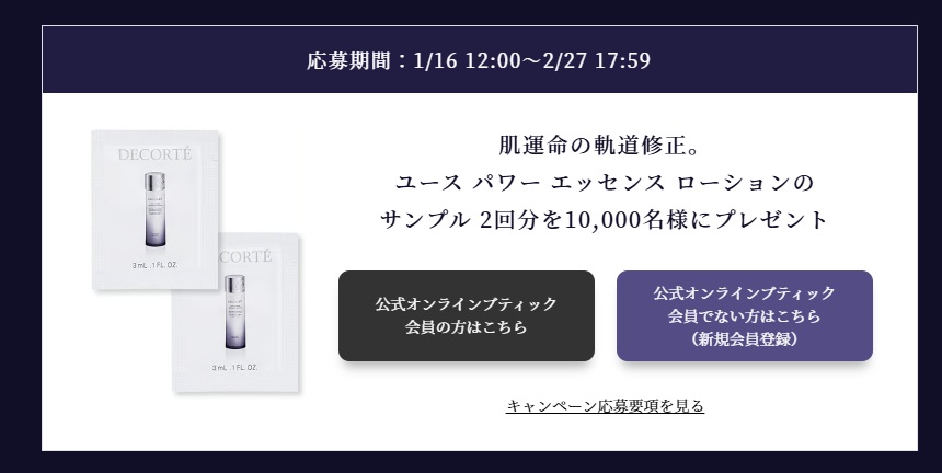 コスメデコルテ「ユース パワー エッセンス ローション」無料サンプル(抽選10,000名)の応募方法・受付期間(3回抽選)・条件・注意点をまとめました。 -
