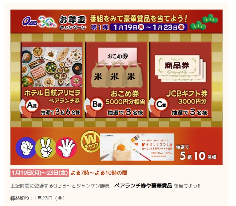 QAB琉球朝日放送「お年玉キャンペーン」視聴者プレゼント。ホテル日航アリビラ ペアランチ券(3組6名)、おこめ券(3名)、JCBギフト券(3名)に応募。Wチャンスでキボリノコンノ展(5組10名)も。応募はWEB、沖縄在住限定・曜日ごと最大5回応募可。 -