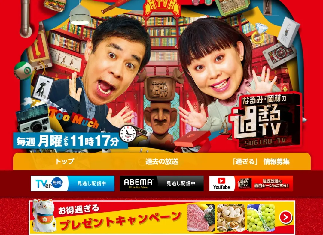 毎週月曜の23時17分から朝日放送テレビで放送の「なるみ・岡村の過ぎるTV」では毎回視聴者プレゼントをやっています🎁