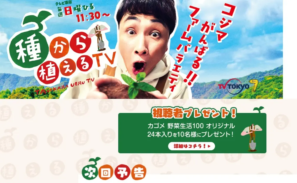 テレビ東京系列で毎週日曜11時55分から放送の「種から植えるTV」で毎週視聴者プレゼントをやっています。 賞品はカゴメ系がメインで野菜ジュースや時期によってはトマト... -