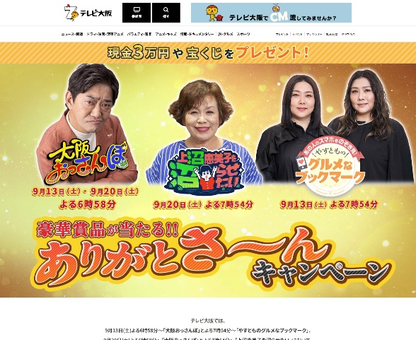 テレビ大阪で9月13日から豪華賞品が当たる「ありがとさ~ん」キャンペーンをやっています。 賞品は現金10万円とハロウィンジャンボ宝くじで合計30名に当たります。 応募... -