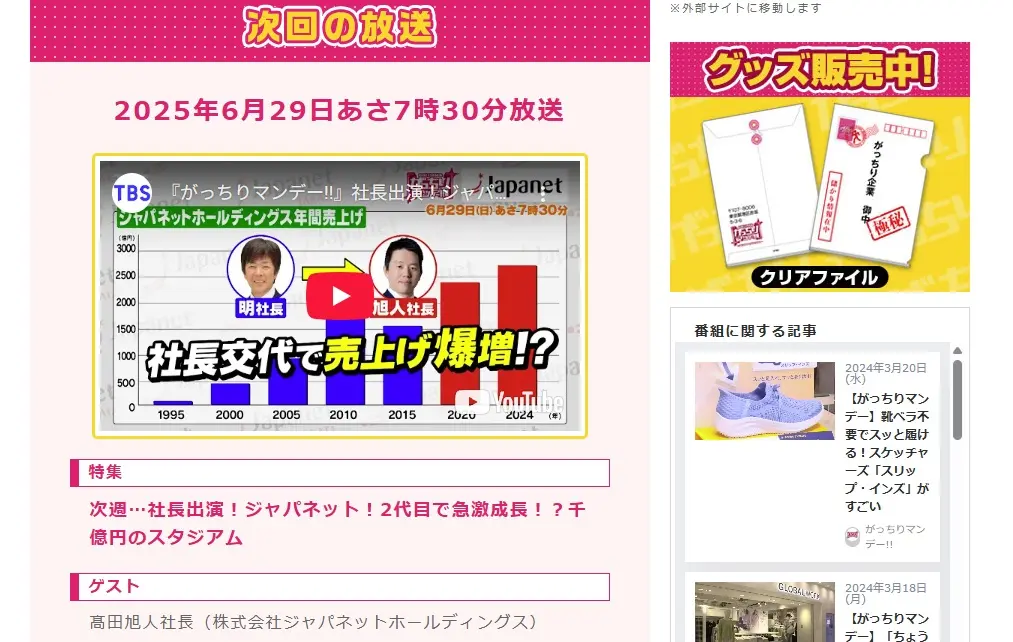 TBSで6月29日7時30分から放送の「がっちりマンデー」ではジャパネットに関する豪華視聴者プレゼントをやるみたいです。 がっちりマンデーでは今回は先行告知的な感じで... -