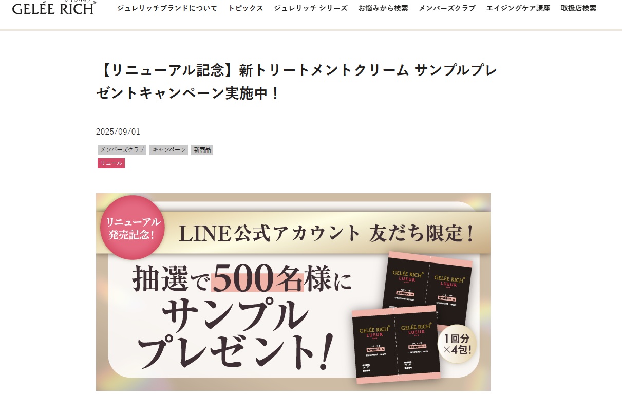 賞品は10月1日にリニューアルするジュレリッチ リュール トリートメントクリームの4回分サンプルです。